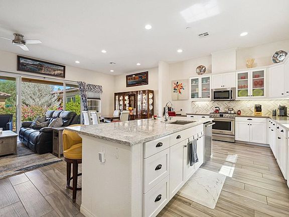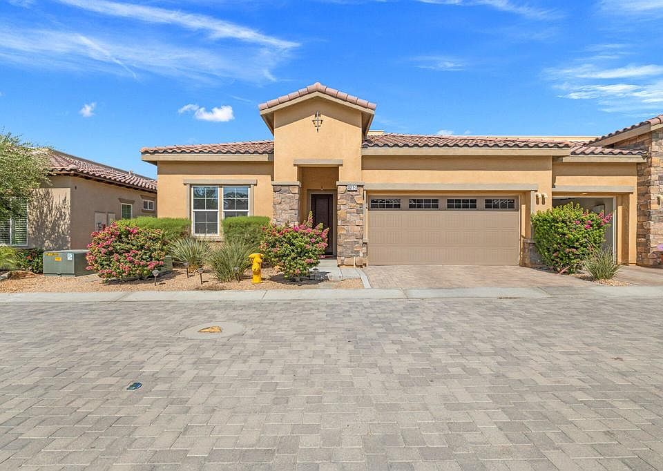Turnkey Furnished Ravello Collection Granada Model in Premier 55+ Community. This beautifully upgraded 3-bedroom, 2-bath home is located in the sought-after Villa Portofino community. Enjoy the privacy of a pavered front courtyard and a covered loggia--perfect for relaxing or entertaining. The open-concept floor plan features wood-look tile flooring, carpet in the bedrooms, and a stylish kitchen with white cabinetry, quartz countertops, a large island, stainless steel appliances, a designer backsplash, and recessed lighting. The spacious primary suite includes a generous walk-in closet and a large bathroom. Energy-efficient upgrades include a tankless water heater, EV charger, and solar panels. Enjoy resort-style living with access to the 30,000 sq ft clubhouse offering a private 100-seat movie theater, cafe and dining room, pool and spa with cantina, a state-of-the-art fitness center, social activities, and more. The low HOA dues include landscape maintenance and a cable package--offering unbeatable value.