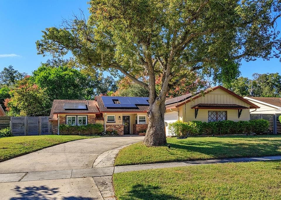 This modern storybook home has a brand new roof and fully renovated interior plus all new landscaping. The cottage-style architecture features diamond-pane windows, rich brickwork, and whimsical curb appeal. Inside, newer luxury vinyl flooring flows throughout plus a full kitchen renovation. You will love the gleaming quartz countertops, stainless appliances, breakfast bar and charming brick backsplash! Both bathrooms have also been fully renovated with new vanities, tile, lighting and fixtures. One of the home’s standout modern feature is the solar panel system installed on the roof—offering immediate and long-term energy savings, reduced monthly electric bills, and the eco-friendly benefits of clean, efficient power. Speaking of power, rest easy knowing that the home's electrical system received a service upgrade to 200A, a new meter, main and interior electrical panel in 2019. Other improvements include newer interior paint throughout, new French doors leading to your spacious 18' x 14' Florida room, the perfect place to start your day with a cup of coffee. New gutters and new landscaping irrigation help keep the yard looking amazing! Outdoor lovers will appreciate the brick paver lanai and raised garden beds just waiting to be planted with herbs and vegetables. Privacy abounds with new fencing and mature hedges. With its rare blend of storybook charm and comprehensive modern updates, this home is truly beyond move-in-ready—it’s turnkey luxury wrapped in character. Come experience one of the best pockets of the Lake Holden area in this stunning, curated property. You won’t want to miss it!