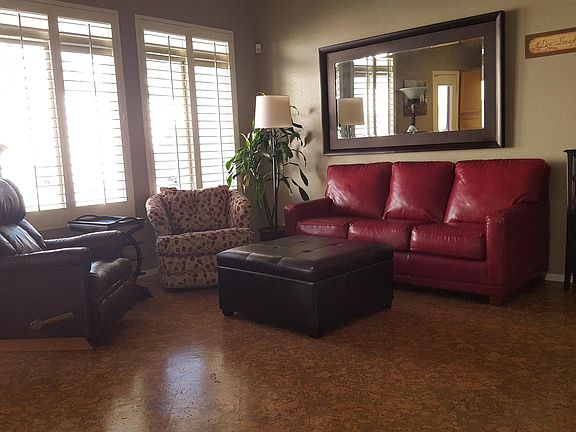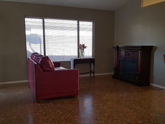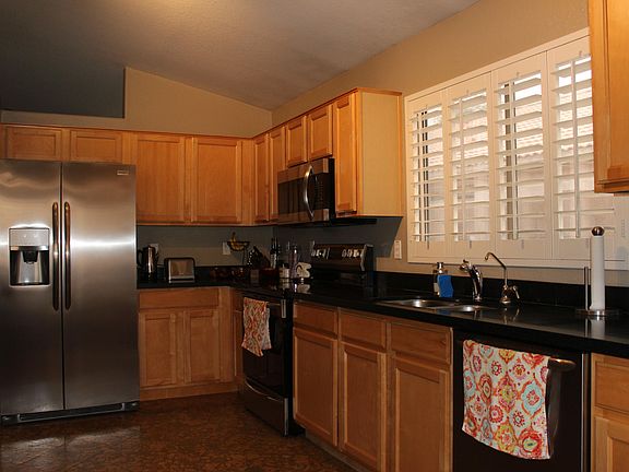 This home features vaulted ceilings, one of a kind cork floors, a split floor plan with 4 bedrooms and 2 FULL baths, open concept kitchen with ALL NEW stainless steal appliances, NEW carpet in bedrooms, FRESH paint, NEW counter tops in bathrooms, OVER SIZED master suite with double vanity AND walk in closet. Front bedroom also has private access to patio. A community pool and spa is available.