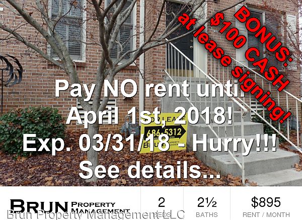 500 to 649 FICO: Pay no rent until 4/1/18.No rent until 4/1/18 plus $100 CASH bonus - Exp. 3/31/18 - $100 CASH bonus at lease signing! - Expires 3/31/18 - Hurry! These are our March 2018 move in incentives for this unit. Our incentives are based upon your FICO score: No FICO score at all: The $100 CASH bonus at lease signing. 500 to 649 FICO: Pay no rent until 4/1/18. Plus the $100 CASH bonus at lease signing. 650 to 799 FICO: Pay no rent until 4/1/18 + 1/2 off 1st month of renewal. Plus the $100 CASH bonus at lease signing. 800 to 900 FICO: Pay no rent until 4/1/18 + 1st month of renewal free. Plus the $100 CASH bonus at lease signing. Please call us or visit our website for all qualifications, terms and conditions. www.brunpm.com. (RLNE2258643)