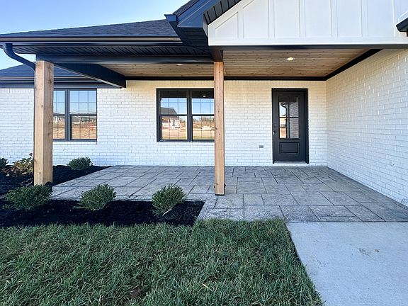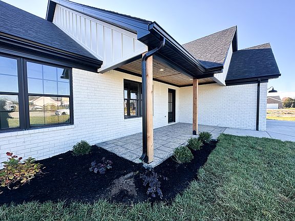 This stunning new construction home in Richmond, KY, offers a perfect blend of style, comfort, and thoughtful design. The exterior features a timeless white brick façade with modern black accents and cedar front porch ceiling and posts, creating inviting curb appeal. Inside, Cairo Oak COREtec luxury plank flooring flows throughout, offering both beauty and durability. The living room centers around a striking black shiplap fireplace with wooden mantle, framed by custom cabinetry with built-in shelving, adding both function and flair. The dining area is enhanced by dramatic black shiplap above, giving the space bold character. Outdoors, enjoy a stamped concrete front porch and a covered back patio, perfect for relaxation or entertaining. Located in a vibrant community with walking trails and green space, this home offers tranquility and convenience. Experience luxury finishes, a prime location, and exceptional design all in one beautiful package.