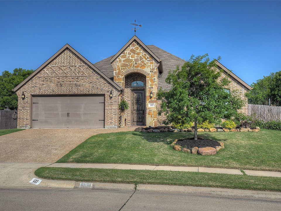 Experience the blend of sophistication and comfort in this 1.5-story, farmhouse chic abode. Its curb appeal will impress with a stone-accented façade, speak-easy door and lush landscaping on a quiet cul-de-sac. Hardwood floors flow through the common areas, met by mosaic-accented tile in the wet areas. It offers neutral paint, custom knotty alder cabinetry, extensive use of crown, wrought iron staircase and split bedrooms. Only the game room and half bath are upstairs. The private office boasts French doors and double tray ceiling. Enjoy gatherings in the open-concept kitchen with a huge island, gas range and corner pantry. It's open to the warm and inviting family room with a gas log fireplace and sunny breakfast nook. Unwind in the primary suite featuring a sitting area, large walk-in closet, and gorgeous bath with a jetted tub, furniture-style vanity and oversized shower. Create memories in the big backyard with a covered patio, extended flagstone patio with a stone-lined fire pit.
