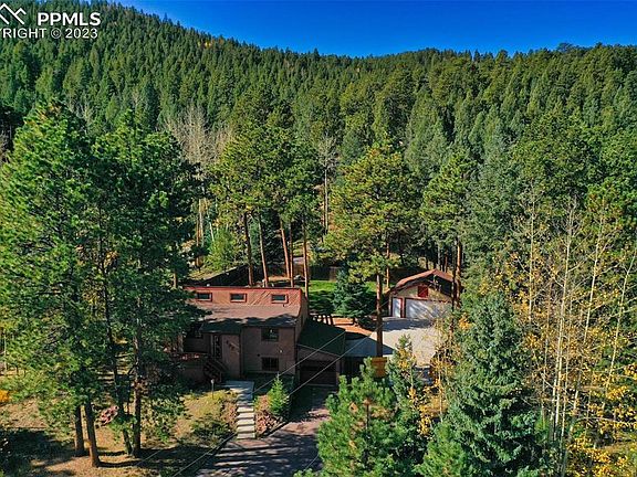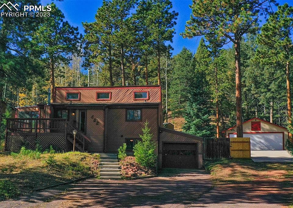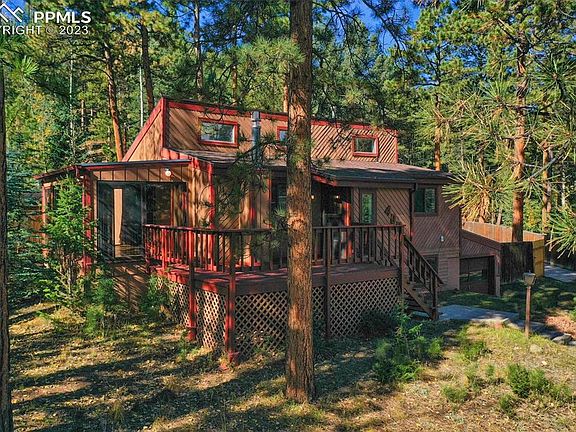 Privacy in the pines yet minutes from downtown this Raised Ranch style home fits everyone's home needs*Over 2000 square feet of living space on spacious flat lot fully fenced*The Great room offers vaulted ceilings, gas fireplace and Australian Cypress hardwood flooring*Open to the kitchen with breakfast bar and ceramic tile*Both Great room and kitchen connect to large Sunroom or Dining surrounded by floor to ceiling windows and walk out to large surround deck*The Sunroom/Dining offers Saltillo tile flooring*Large master bedroom is connected to full bath and another bedroom completes the main level*Lower level has very large family room with wet bar, hammered copper sink and full sized refrigerator*Another freestanding gas stove keeps the lower level cozy*Both gas stoves are Heat & Glo thermostat controlled* An additional bedroom, 3/4 bath and large laundry complete the lower level*Both freestanding gas fireplaces have Eldorado Stone surround as well as the wet bar*Detached 2 car oversized garage with protective colored epoxy floor coating and 2nd upstairs level fully decked for additional storage - this is truly the dream garage/shop set up! Large concrete pad /driveway area great for an RV or extra vehicles*The back yard is fully fenced and seeded with Rocky's ballpark grass seed mix for cold and heat tolerant green turf*Furnace and Hot water heater are new 2022, Kitchen sink and disposal are 2023 new and front and rear surround deck just painted 1 month ago*Hot tub conveys "as is"*Hard to find property with all these amenities! Close to several world class fishing areas, close to Colorado's famous ski resorts and less than an hour to Colorado Springs airport*This is a must see!