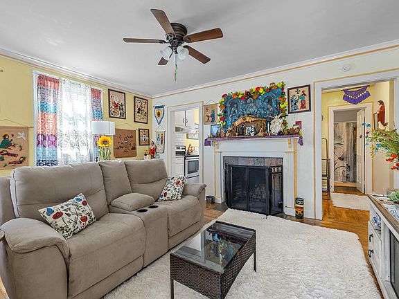 Cozy fireplaceInviting covered front porchStylish white cabinetryUpdated kitchenStainless steel appliancesModern backsplashOriginal hardwood floors