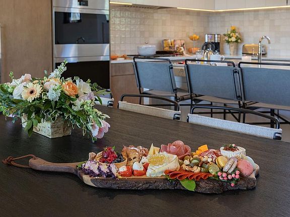 Elevate your mood in the great room with 12-foot vaulted ceilings featuring a massive custom Pompeii quartz island that and includes Wolf and Sub-Zero appliances, an ample wine cooler, gas fireplace and white oak flooring. A large wet bar spans the length of the great room, perfect for relaxing with friends with in-drawer refrigerators, sink and custom ice maker. The living room area features a spacious sectional and chairs facing a floor to ceiling custom gas fireplace and 4k entertainment center. A deck with sweeping views of the Elk Refuge sits adjacent to the living room.