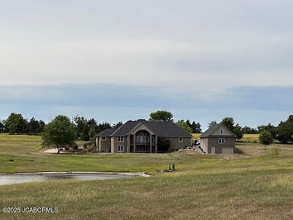 Stunning Estate on 20+ Acres with Lake, Detached Guest Suite & More - Just 10 Minutes from Town! Welcome to this beautifully maintained, all-brick estate set on over 20 acres of scenic open ground with its own private lake - the perfect blend of peaceful country living and conveniences. This unique home features a thoughtfully designed floorplan with elegant curved walls, split-bedroom layout, and a main-level office. Inside, you'll find hardwood floors, a cozy gas fireplace, and modern updates throughout. The spacious primary suite offers a relaxing retreat, while the fully finished basement includes a second kitchen - ideal for entertaining or multi-generational living. Step outside to enjoy the serene surroundings from the deck, patio, or lakefront. The property also includes a newly added detached garage with a finished bonus room and full bathroom upstairs - perfect for a guest suite, game room, or man cave. There's also a large metal building for storing your tractor, equipment, or recreational toys. With 6 garage spaces, tons of finished square footage, and endless outdoor space, this one-of-a-kind property offers room to live, work, and play.