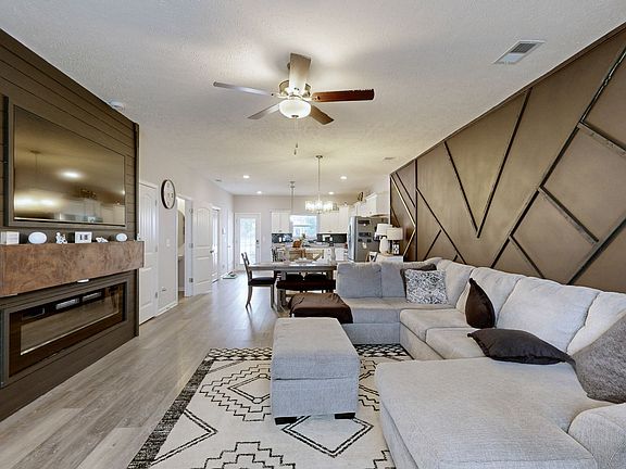 Cozy electric fireplaceCenter islandOpen-concept main floorStainless steel appliancesUpdated kitchenSpacious back patioModern backsplash