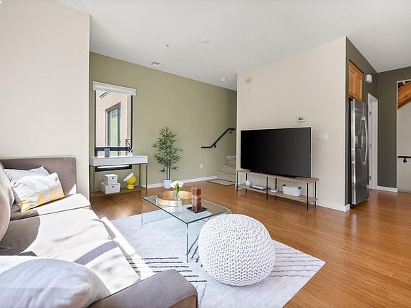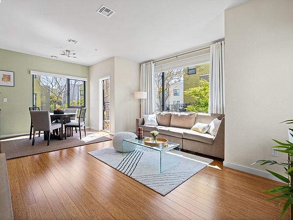 Welcome to 402 Palisade Drive, your new home! This rare and charming 2-bedroom, 2.5-bathroom corner townhome is nestled in the vibrant West Oakland neighborhood. As a south-facing end unit with windows on three sides, natural sunlight floods every room, creating a warm and inviting atmosphere. The main level boasts an open floor plan, seamlessly connecting the kitchen, dining area, and living room—perfect for hosting guests. Upstairs, the two spacious bedrooms each enjoy plenty of natural light and cozy wall-to-wall carpeting. Both the primary bedroom and the second bedroom are complemented by their own full bathroom with a shower over tub. Your private side-by-side garage provides direct access to your home, featuring convenient space for washer/dryer and additional storage. Located just minutes from popular destinations like IKEA, Target, Safeway, Home Depot, BART, and the Oakland Ballers Raimondi Park, this townhome offers the perfect blend of convenience and serenity. Make 402 Palisades Drive your new home today!