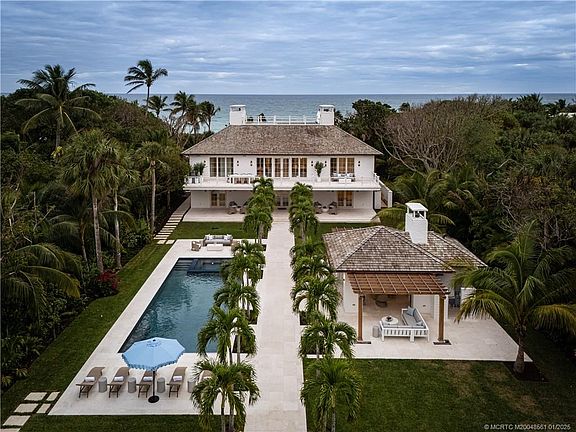 Experience coastal luxury in this all-new construction masterpiece that's like owning your own 5-star resort. Nestled on 2+/- acres with 150 feet of direct ocean frontage, complete with a private beach equipped with power and water. Be the first to own this legacy property, designed for lasting durability and timeless elegance. The property offers 7 ensuites, 11 bathrooms, breathtaking ocean views, sweeping balconies, and a west-side garden. Built with limestone, cypress, oak, and copper, blending modern technology with enduring quality. Guesthouse includes a fitness room and kitchenette. A spectacular palm allee creates a pool pavilion paradise that includes a fireplace, lush landscaping, and a motor court with a 4-car garage. A rare opportunity for unparalleled luxury on Jupiter Island.