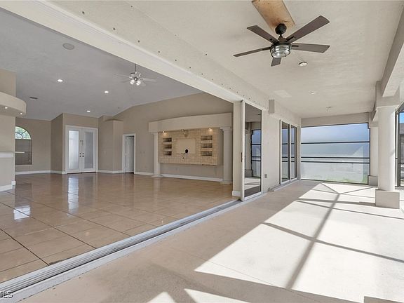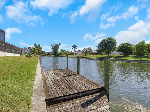 NO FLOOD ZONE, UTILITIES IN AND PAID IN FULL. Southern rear exposure pool/spa home on freshwater canal with city water and sewer in and paid in full. This great room designed home has a huge 8' tall, 4 panel pocketing sliding glass door that completely disappears and effectively doubles the size of your living room for the indoor/outdoor experience. The under-truss lanai overlooks the large pool and spa area, making this the perfect place to enjoy the Florida weather. The Southern rear exposure means your pool is always sparking in the sun which is the best way to have a pool. The Large Primary Suite has walk in closets, dual vanities, and walk in shower. Home is a split bedroom layout, meaning Primary and Guest bedrooms are on opposite sides of the home for privacy. Oversized garage has additional room for storage. Outside you have automatic irrigation system, established lawn, and mature tropical landscaping. Centrally located off of Santa Barbara, between Veteran's and Pine Island Road, this home is convenient to both bridges, shopping, dining and entertainment.