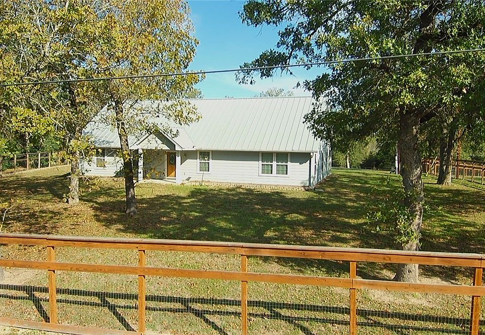 Imagine life on a sprawling acre plus property in a desired subdivision by the lake that evokes a sense of both luxury and tranquility. Nestled under towering oaks is a 3/3 home complete with a covered RV pad with electric and a 1600 square foot, red iron garage that includes a full bath and enclosed room that can be used for an office, storage or potential living quarters. Entering through the iron privacy gates, a coveted concrete driveway leads to the garage and the covered back porch that spans the length of the home. Upon entry, you are drawn to the 14 foot ceiling in the Great room. The bedrooms are split and both guest bedrooms are spacious. The primary bedroom will impress - a large walk in closet plus the room is spacious enough for a sitting area. Dual vanities, water closet and large walk in shower compliments the primary bath. The kitchen is open to the Great room and offers an island that can be the centerpiece of gatherings, providing both functionality and a welcoming atmosphere. The laundry room is off the kitchen and is accessible to the back porch, effectively merging indoor and outdoor convenience. Subdivision amenities include paved roads, street lights, community pool, VFD, Helipad, trash site, boat ramp and is just minutes to Lake Somerville's Birch Creek State Park.