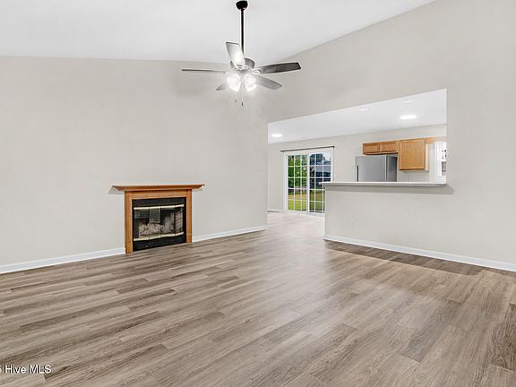 The open floor plan is perfect for entertaining or enjoying time at home, featuring LVP flooring in all living areas for easy maintenance and a modern look. The spacious living room boasts a cathedral ceiling, ceiling fan, and cozy fireplace, creating a warm and welcoming atmosphere.