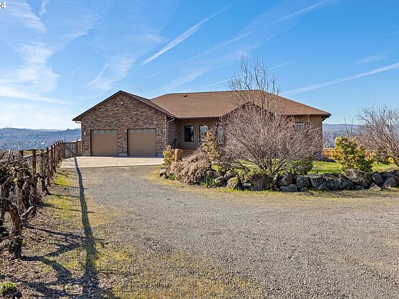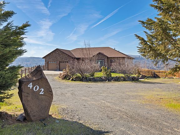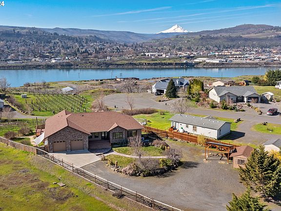 Custom-designed home boasting breathtaking views of Mt. Hood, The Columbia River and The Dalles City lights! Nestled on a south-facing lot at the end of an established and tranquil dead-end street, offering privacy and space on the nearly 1/2 acre lot. The hardscape entry and grande steps lead to a spacious layout featuring bay windows. With 4 bedrooms + office and 3.5 baths, this home offers ample space for family living and entertaining. The main level features a separate wing for the primary suite and laundry on the main. Entertain with ease in the gourmet kitchen and the adjacent step-out deck. The lower level presents a walk-out daylight basement, complete with a full kitchen, bathroom, bedroom and patio; ideal for hosting guests or creating a separate living space.The lot features mature landscaping, in ground sprinklers, a welcoming fountain and more. The property also includes a 2-car extended size garage, outbuilding and additional covered space, ensuring plenty of room for your storage and hobbies. Experience the perfect blend of luxury, comfort, and natural beauty in this exceptional home.
