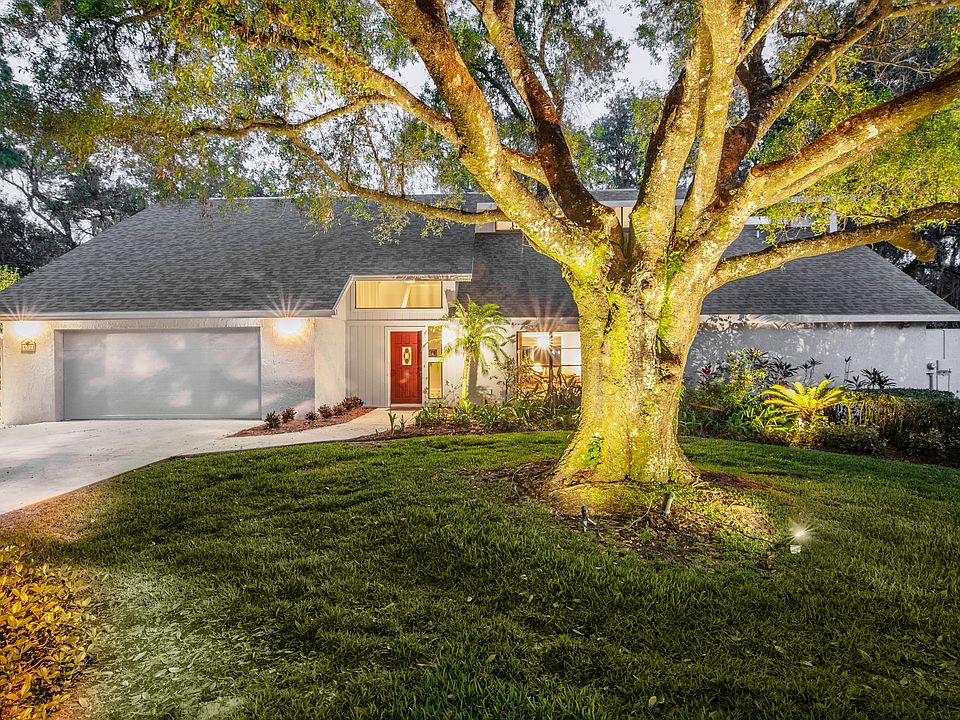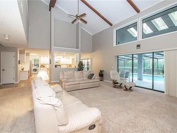 Have you been waiting for the perfect home to hit the market? The wait is over! Nestled on a peaceful cul-de-sac the two-story home features about 3403 square feet of living space, 5473 square feet under roof with five bedrooms and three bathrooms, including a downstairs master suite on the main level, an updated kitchen with casual dining nook, living room, formal dining room, full bath and a utility room. The gorgeous living area, with a tall, 24ft. vaulted ceiling and spectacular wooden beams, features a cozy wood burning fireplace and is accented by sliding glass doors to view the pool. Equipping the updated kitchen is ceramic tile flooring, a large beautiful island, bright eating area, freshly painted wood cabinets, new granite countertops, a new sink with new fixtures, and a ceramic tile backsplash. Next to the living room you will find the spacious master suite with plush carpeting and sliding glass doors leading out to the pool and back screened in patio area. Upstairs you will find 4 more large bedrooms, updated full bathroom, all have plenty of closet space. Enjoy the private oversized balcony, attached to 3 bedrooms looking out at the trees and and the garden below. If this isn't enough, we have a BACKYARD OASIS that you will not want to leave! THE OVER-SIZED SCREENED-IN LANAI OFFERS A sparkling pool, soothing waterfall, covered sitting area with ceiling fans, oversized wet bar, open air sitting area. NO HOA!!! Easy access to everything. This home is a once in a lifetime find! Call today!