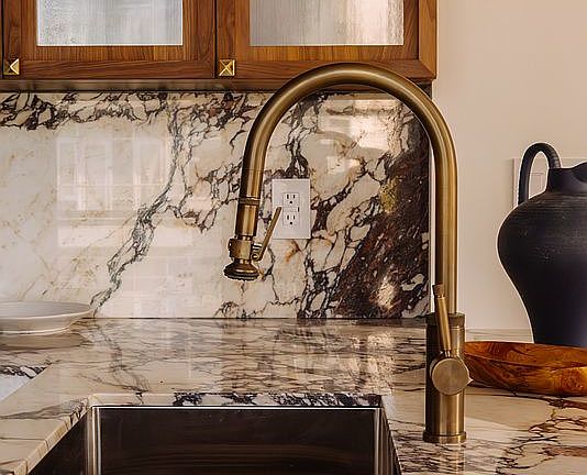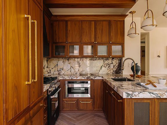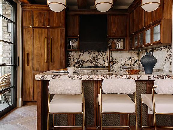 Polished Calacatta Vagli Rosatto marble countertops and chic Waterstone fixtures adorn a windowed kitchen with an eat-in peninsula, balancing rich walnut shaker-style cabinetry with bespoke metal hoods and antique metal mesh accents. The high-end appliance suite includes a 5-burner Bertazzoni Nero range, a Bertazzoni microwave oven drawer, and a Fisher & Paykel French door refrigerator. A private balcony off the kitchen allows for seamless indoor-outdoor entertaining and is perfect for alfresco meals, gardening, and more.