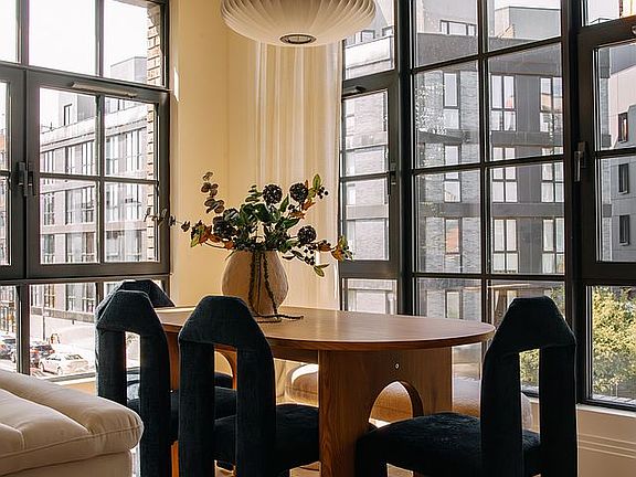 Direct elevator entry reveals interiors marked by an expansive floor-through layout, an open-plan living area, and a private balcony, offering an organic, serene escape in the heart of Brooklyn. Southern and western light pours through picturesque, oversized windows. French vanilla honed marble door thresholds punctuate matte herringbone white oak floors, and custom 32-inch-high wainscoting runs throughout.