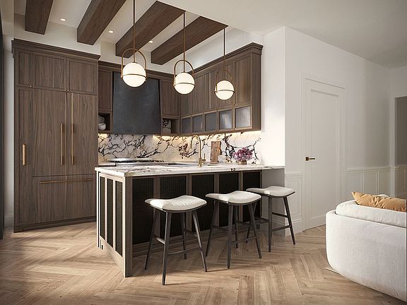Interiors are marked by an expansive floor-through layout and an open -plan living area . Southern and western light pours through picturesque, oversized windows. French vanilla honed marble door thresholds punctuate matte herringbone white oak floors, and custom 32-inch-high wainscoting runs throughout .