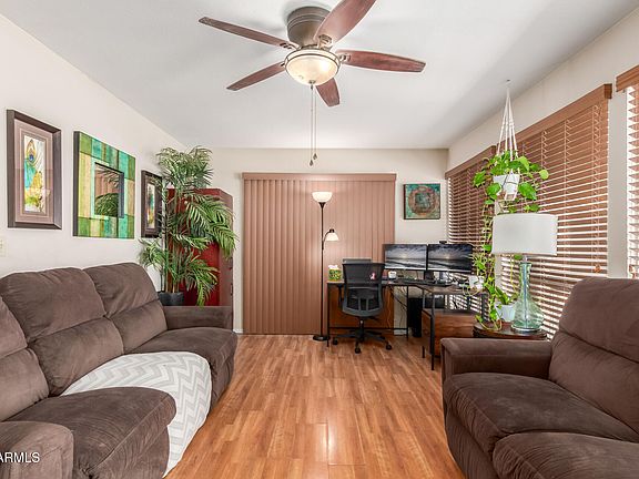 Welcome to this beautifully maintained 2 bedroom, 2 bathroom patio home located in the heart of Tempe just minutes from ASU, major freeways, shopping, and the vibrant energy of downtown Tempe or Scottsdale. Step inside to find warm laminate wood flooring throughout and an abundance of natural light thanks to five strategically placed solar tubes. The enclosed Arizona room offers a perfect bonus space for relaxing, working, or entertaining year-round. The home features an enclosed 2-car carport with an electric garage door opener for convenience and security. Enjoy your private patio surrounded by mature fruit trees including lemon, honey orange, grapefruit, and pomegranate your own backyard oasis! With no HOA, extra storage in the back,