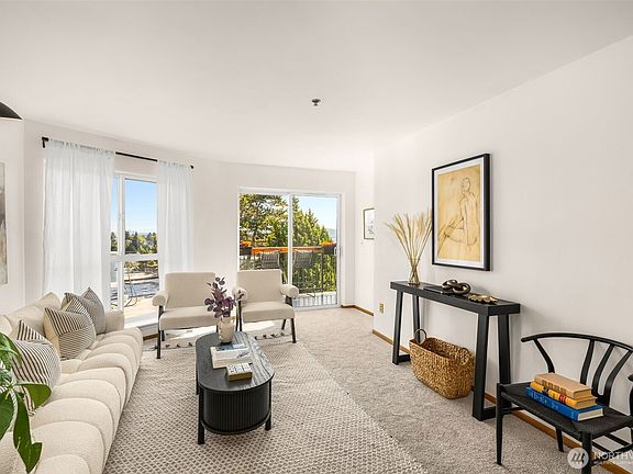 This top-floor condo with panoramic VIEWS of Mount Rainier, Cascades, Lake Union & sparkling Seattle skyline from your private balcony, is an INCREDIBLE VALUE. Sunny & spacious layout flows seamlessly from dining to living area, floor-to-ceiling windows frame stunning views. Large kitchen w/ stainless steel appliances, breakfast bar, great counterspace. Pristine condition: new carpet, new paint, sleek finishes, in-unit washer/dryer. Secure garage parking w/ storage & EV outlet ready. Unit located in QUIET, sought-after rear building, NOT FACING Aurora. Solid HOA, pet friendly, elevator, no rental cap! Unbeatable location—just blocks to Fremont’s top cafes, parks, shops & rapid transit. 91 walkscore, minutes to Downtown, UW, I-5. A MUST SEE!