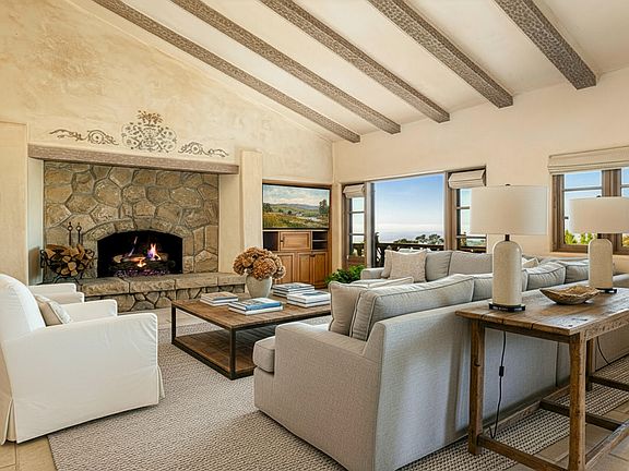 Showcasing remarkable quality and designed for a life both refined and relaxed, the +/- 1.48-acre property offers elegant accommodations for residents and guests alike: a nearly 4,200 sqft main residence with an attached 2-car garage, a gated entrance and spacious ocean-view motorcourt, a detached +/- 1,322 sqft guest house, a sparkling pool, two offices, and more! Inside, an ocean-view family room with soaring, open-beam ceilings, a gorgeous stone fireplace, and French doors to the outside provides an inviting central gathering point. Adjacent to the family room is a stunning gourmet kitchen appointed with top-tier appliances, refined finishes, a sunny breakfast area, and panoramic views. The formal living and dining areas feature large windows and French doors opening to sweeping terraces and patios.