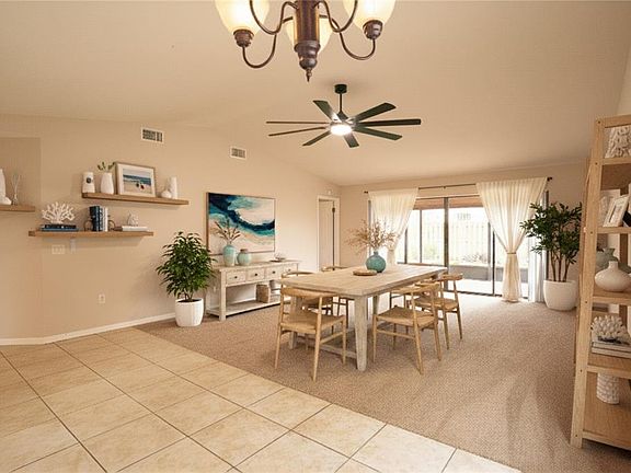 One or more photo(s) has been virtually staged. Welcome to your dream home in Cypress Landing, where comfort meets convenience in this inviting three-bedroom, two-bathroom residence featuring a spacious two-car garage. The open-concept design effortlessly combines the dining and living areas, enhanced by high ceilings and an abundance of natural light from a large wall of windows and sliding glass doors that lead to a serene screened lanai. The thoughtfully designed split bedroom layout offers two cozy bedrooms at the front of the home, while the expansive primary suite at the back boasts an en suite bathroom with a luxurious shower and a generous walk-in closet, along with direct access to the lanai through another set of sliding glass doors. The kitchen is a chef's delight, equipped with a closet pantry and a dining nook, with additional sliding glass doors leading to a charming side porch. Enjoy the benefits of a separate laundry room, tile flooring in the kitchen and dining areas, and plush carpeting in the bedrooms and living room. Outside, the fully fenced backyard provides a private retreat, while the exceptional community amenities—including access to Lake Dexter, a heated pool, clubhouse, tennis and pickleball courts, fishing pier, private boat ramp, and boat parking—make this home the perfect blend of relaxation and recreation.