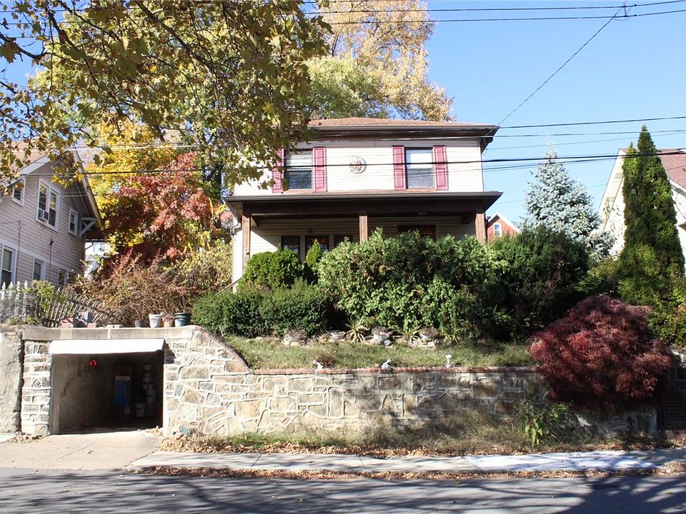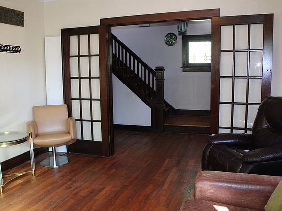 This warm and inviting home sits gracefully above a charming stone wall, featuring a spacious front porch hidden behind a screen of evergreen bushes. Step inside to find a lovely entryway with a wooden banister, stained glass window and hardwood floors throughout the first floor. The living room boasts French doors, a decorative fireplace, and stunning stained-glass windows. The dining room offers space for table and sideboard with windows overlooking the private backyard. The kitchen offers plenty of cooking space, room for a small table, and access to the backyard with a ramp leading to an off-street parking pad. Upstairs, there are two generously sized bedrooms, one smaller bedroom, and a full bathroom. The basement includes a carpeted game room, a separate laundry area, a full bath, and storage, with direct access to the garage.