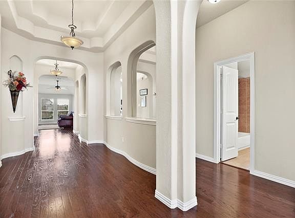 This single story home exemplifies pride of ownership throughout!! As you enter the home you will be welcomed with arched doorways, art niches, tray ceiling, beautifully updated fixtures, wood flooring and much more custom features*Formal dining*Kitchen features breakfast bar, custom cabinetry, granite counters, SS appliances & pendant lighting*Living room with corner WBFP & lots of windows overlooking backyard*Breakfast nook*Private master suite with sitting area, garden tub, separate shower & large closet*Spacious secondary bedrooms*Utility room with tons of cabinets*Covered patio perfect for entertaining*Close to the community pool, playground & ponds*Within walking distance of the schools*Great location!!