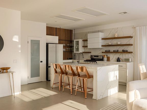 This beautifully remodeled Mediterranean-style home seamlessly blends timeless elegance with modern luxury. The open floor plan creates a spacious, inviting atmosphere, perfect for both entertaining and everyday living. Outside, enjoy the BRAND NEW heated saltwater pool and spa with premium Jandy equipment, surrounded by meticulously designed hardscaping, lush turf, river rocks, and palm trees. The fresh Greek Villa exterior paint enhances the home's Mediterranean charm. The custom kitchen features LED wood shelving, iron floating shelves, and a Samsung BESPOKE refrigerator, combining style and functionality. Luxurious marble bathrooms with minimal chic toilets elevate the home's aesthetic, while the master bath offers a spa-like experience with a Bluetooth speaker and LED changeable lighting mirror. Modern conveniences include a recently installed water heater and Culligan water softener, ensuring comfort and efficiency. This Mediterranean gem is a perfect blend of classic beauty and contemporary upgrades, offering a refined and luxurious living experience.