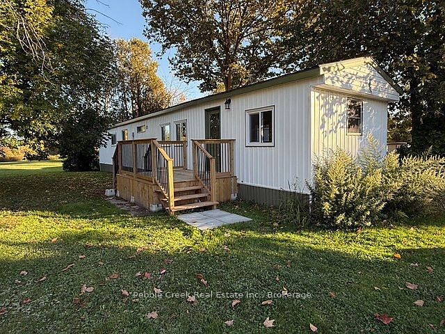 Better than new! Fully renovated mobile gutted to the studs with new insulation in the walls, floor and ceiling, new drywall and plumbing. Features include new flooring throughout, some replacement windows, an updated kitchen, with plenty of cabinets and pantry with pull-out shelving, updated 4 pc bath with laundry hookup, 3 bedrooms and new deck. The maintenance free exterior sports new vinyl siding and a metal roof! This beautiful home is set on a large corner lot with mature trees, just minutes south of Clinton in a quaint land lease community. Bonus - new fridge, stove, washer & dryer included! Available for immediate possession.