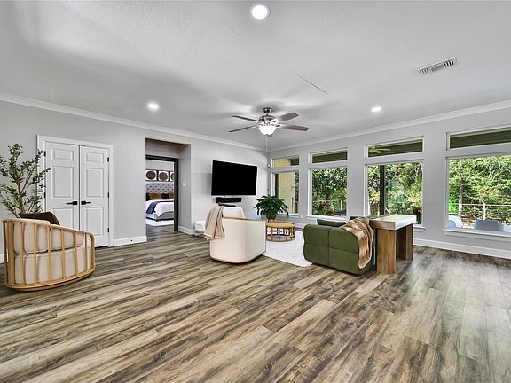 White brick homeHigh ceilingsWall of windowsAbundant natural lightDining areaLvp flooringGranite countertops