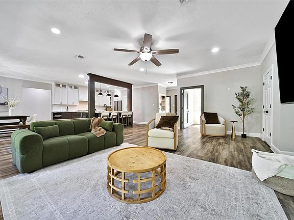 Beautifully remodeled 1-story white brick home on 2+ acres backing to nature in the hidden gem subdivision of Cimarron Country. Private driveway leads to this 4 bed/2-bath home featuring high ceilings, crown molding & LVP flooring throughout. Open concept living area offers wall of windows showcasing serene outdoor views. Spacious, modern kitchen includes granite countertops, farmhouse sink, custom cabinetry, backsplash, wine fridge & new appliances, including 8-burner gas cooktop w/griddle, flowing seamlessly into the dining area. Primary suite features abundant natural light, sitting area & luxurious ensuite bath with frameless shower & large walk-in closet. Two secondary bedrooms share updated full bath, plus flexible 4th bedroom option. Private office with built-ins. Outside, detached 2-car garage, patio w/extended deck and whole-home generator. Additional updates including new roof (2024), plumbing & electrical fixtures, sprinkler controller (2022) and more; see attached list.