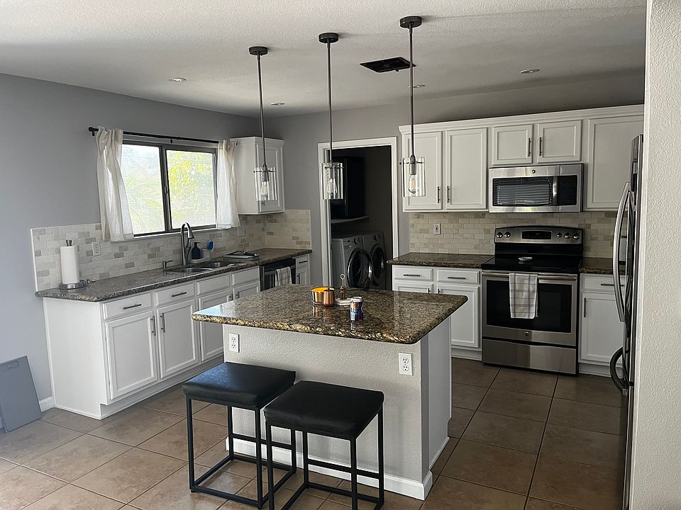The spacious eat-in kitchen features white shaker cabinets, granite countertops, pantry, and comes equipped with a Samsung Smart refrigerator and front-load washer and dryer. Tile and laminate flooring run throughout the home (no carpet), keeping it clean, light, and comfortable.