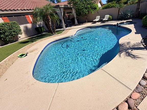 Sparkling poolModern upgradesBright open floor planLow-maintenance livingDesert landscapingWhite shaker cabinetsPrivate backyard