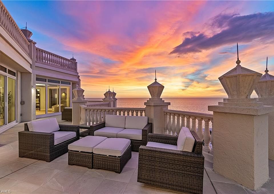 An extraordinary offering in the heart of Park Shore, Penthouse 14 at The Brittany presents a rare opportunity to own a one-of-a-kind residence with 4 bedrooms + den, 6,435 square feet of interior living space, and 1,950 square feet of wraparound balcony showcasing panoramic views of the Gulf, Venetian Bay, and Naples skyline. Thoughtfully curated by UpVail and Architectural Wood Expressions with a level of craftsmanship seldom seen, the home features hand-selected European select-grade White Oak flooring, dry-laid quartzite and marble surfaces, grain-matched custom European millwork, and Level 5 finishes throughout. Built with 5/8-inch drywall and mineral wool insulation for enhanced structural integrity, sound attenuation, and climate control, the residence also offers invisible audio speakers, a Control4 smart system, ultra-clear shower enclosures, Samuel Heath plumbing fixtures, Emtek hardware, and a full suite of Miele appliances. Distinctive highlights include a water vapor fireplace in the clubroom, electric fireplace in the primary suite, and countertops custom-fabricated in Chicago with precision installation. Additional features include private key-secure elevator entry, three deeded parking spaces, a finished deeded cabana, and an air-conditioned storage room at the garage level. The residence also enjoys exclusive rooftop access—a rare and valuable amenity offering a blank canvas for a future floating deck, spa, sun lounge, or pet area with synthetic turf. Offered fully furnished with a refined, designer-curated furnishings package, this turnkey residence delivers an elevated lifestyle in every detail. Residents of The Brittany enjoy resort-style beachfront amenities including a pool and spa, tennis courts, fitness center, guest suites, 24-hour security, and immediate proximity to Venetian Village. Boat slip leasing or purchase at the Venetian Yacht Club is also available, completing a truly exceptional coastal living experience.