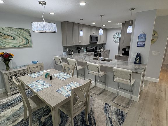 This stunning, bright and light 2-bedroom, 2.5 bath two story home was completely remodeled in 2025. With beautifully appointed Quartzite countertops, vinyl plank floors, new kitchen cabinetry and stainless-steel appliances, no detail was left out. The large open floorplan main level boasts an entertainer's kitchen with countertop bar seating and plenty of counter space. A separate dining room located off the kitchen connects to the large living room, and two large slider doors provide access to the generously sized, private patio surrounded by lush tropical greenery. A dedicated heating and AC unit serves the main level of this end unit property, which also offers a newly remodeled half bathroom and direct garage access into the home. An additional dedicated outside parking spot is also included.