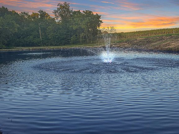 Picturesque pond with fountainMature hardwoodsFields of white clover