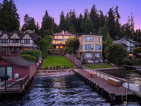 Distinctive waterfront retreat offering extended days of entertainment & luxurious living. Enjoy all the views...Lake Washington, Mt. Rainier & twinkle lights at night. This amazing home underwent a thoughtful & substantial remodel in 2017, creating open spaces, Nana wall for seamless indoor/outdoor living, & exquisite finishes. The epicurean kitchen features custom cabinetry, 2 sinks/2 dishwashers/2 wine refrigerators/2 wine towers & walk-in pantry. Creative built-ins are found in both main floor offices & thruout the home. Owner suite is a sanctuary with a Juliette deck, spa-style bath & spacious walk-in closet incl W/D. Manicured yard draws you to no-bank water's edge with private dock for boat & other watercraft. Sonos system/EV outlet.
