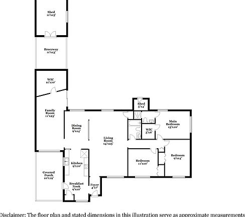 The floor plan offers 4 well-sized bedrooms and 2 full bathrooms, including a private main suite with an attached bath and tiled shower. A bonus family room at the back of the home provides extra space for entertainment or a quiet retreat. The layout also includes a breezeway connecting to a spacious storage shed, ideal for hobbies, tools, or additional storage.