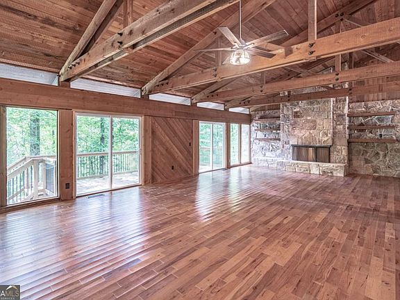 A perfect retreat on 1.2 private acres with no HOA, this rare property combines space, privacy, and convenience. Tucked away on a quiet, tree-lined lot that feels like your own getaway, it's still just minutes from top schools, shopping, and parks. Drive through an elegant roundabout driveway and step inside this newly remodeled craftsman beauty. The main living area welcomes you with an architecturally designed wooden high ceiling, skylights that flood the space with natural light, a cozy brick fireplace, and a striking stone accent wall over gleaming wood floors. The owner's suite is a true retreat - featuring an accent wall, massive walk-in closet, spa-style bath with a wide double shower and jacuzzi, and direct access to a private deck overlooking the wooded backyard. The spacious modern chef's kitchen offers abundant white cabinetry, granite countertops, a kitchen island, breakfast nook, and trash compactor - perfect for cooking and entertaining. Secondary bedrooms feature brand-new carpet and a convenient Jack-and-Jill bathroom. Throughout the home, you'll find ceiling fans in every room, expensive plantation shutters, and designer contemporary lighting fixtures. The house is all-electric and comes equipped with a new HVAC system, new AC units, and a new water heater for total peace of mind. Additional spaces include a sunroom filled with natural light, a separate dining room, a bonus/flex room ideal for an office or hobbies, and a workshop. The 2-car garage and private wooded backyard add comfort, practicality, and plenty of room to relax or expand. Whether you enjoy the fully remodeled home as it is or create your dream estate, this property gives you room to unwind, connect with nature, and make it truly yours.