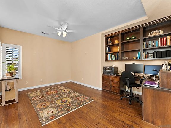 Beautifully maintained SINGLE STORY 2-bedroom, 2.5-bath residence with a den! Located in the premier 55+ gated community of The Colony offering nearly 2,100 sq. ft. of living space on a 7,000 sq. ft. lot, this home is filled with NATURAL LIGHT and has beautiful GOLF COURSE VIEWS! The formal living and dining rooms feature VAULTED CIELINGS, laminate wood flooring and CUSTOM PLANTATION SHUTTERS leading into the spacious great room. The kitchen showcases crisp white cabinetry, ample storage, a dual sink, and an island with a built-in cooktop—perfect for meal prep and entertaining. The adjoining family room offers a cozy tiled fireplace, a newly added CUSTOM-BUILT entertainment center and large windows that frame the serene backyard VIEWS. The spacious primary suite includes double-door entry, dual vanities, a soaking tub, a separate walk-in shower, and new bathroom tile flooring. A secondary bedroom and a versatile den with a custom built in desk provide flexibility and comfort. Step outside to your PRIVATE backyard retreat with a covered patio, ceiling fan, low-maintenance landscaping, and peaceful golf course views. The front yard is fully maintained and watered by the HOA, and the two-car garage includes an additional golf cart parking space. The Colony is one of Southern California’s most desirable active adult communities, featuring a resort-style clubhouse, year-round pool and spas, fitness center, tennis and pickleball courts, library, billiards, and so much more. Experience the perfect blend of comfort, community, and leisure in this exceptional home!