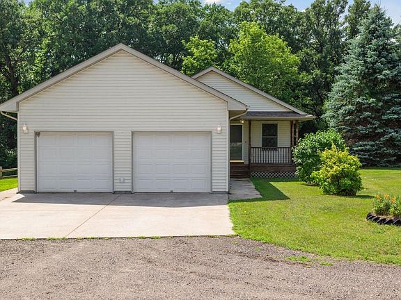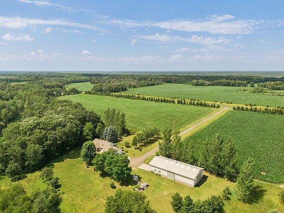 Enjoy quiet country living w/ this wonderful 1-story home on 80 acres of land near Wild River State Park! 33 acres are tillable, currently w/ hay & corn. Remaining acres are woods, grass & swamp. Attached 2 car garage, ground source heat/cool pump, outdoor wood boiler, 2-stage propane furnance & 2600sqft pole barn included in this country retreat. Outdoor wood boiler heats the front part of the barn; attch garage flr, basement flr, flr of the 4 season porch, front sidewalk & hot water tank. There is a deer shack w/ 6 bunks on the propty to hunt whitetail deer, bear & turkeys! Front porch welcomes you into a bright sunny liv rm open to informal dining & kitchen. Mudrm w/ pantry & laundry off kitchen. Lovely 4 season porch w/ tranquil views of a spring-fed creek & woods, walk out to a large private deck. 2BR & 1 1/2BA on the main lvl. Walkout finished LL 700 addt'l sqft of living space, incl a huge fam rm, 3rd BR & 3rd BA! Fresh paint throughout the home! Basement has just been finished.