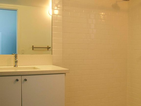 - subway tiled bathroom, terrazzo shower, quartz countertop