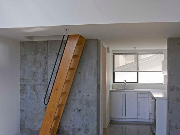 Private patioWood floors in loftKitchenette with custom cabinetryQuartz countertopsTerrazzo showerSubway tiled bathroomSecure gated building