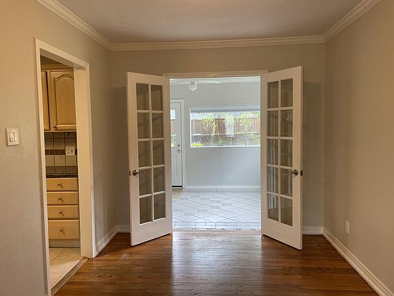 A sunroom with interior French doors makes an excellent home office. The sunroom looks out on the deck and big backyard. Huge oak trees provide shade for the fenced-in backyard.