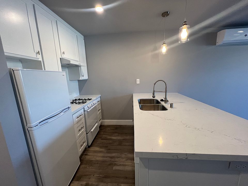 1 bed 1 bath loft style with quartz counters, tile floors in the bathroom, laminate floors in the living room, kitchen, and bedrooms. Refrigerator, stove and dishwasher included. The unit has a small balcony and HAS AIR CONDITIONING