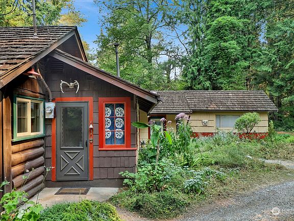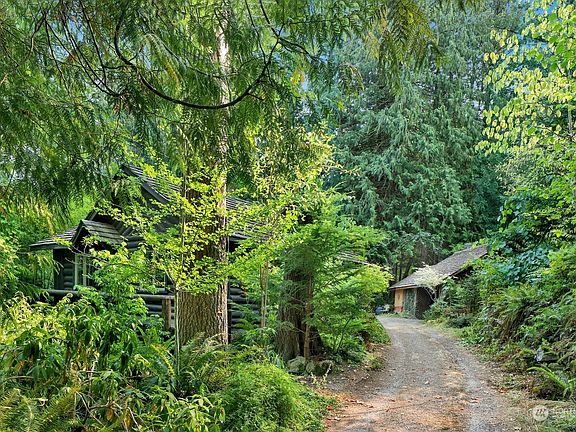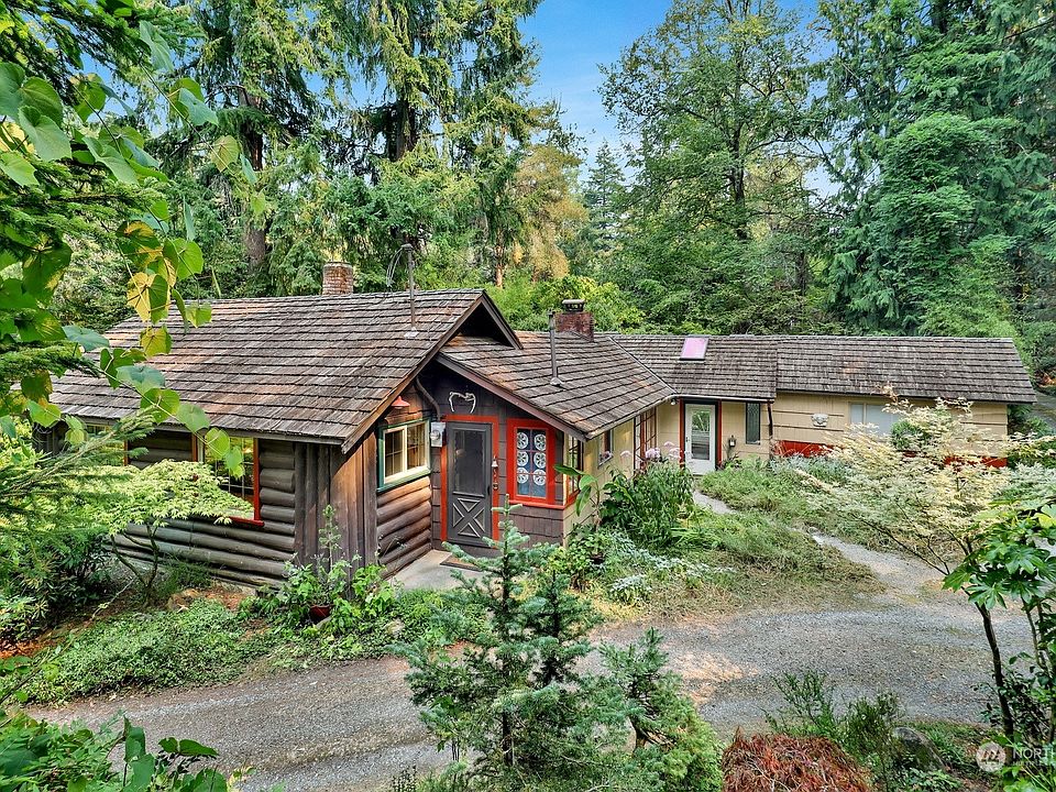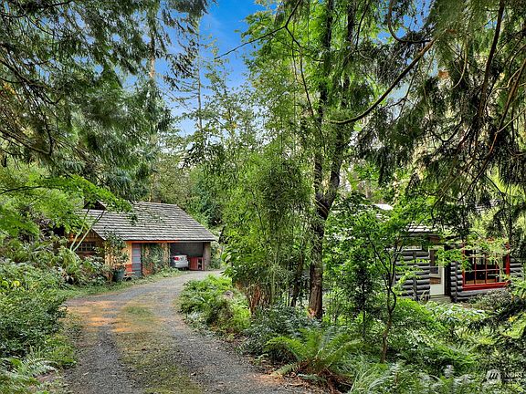 Charming 1939 cottage set on a rare 2 acre in town lot! This split log & cedar shake home has vaulted ceilings, cedar paneling, fir beams, french doors & fireplace in the living room. Solid wood doors, multi pane windows & nice built ins throughout add warmth & character. Primary bedroom also has a cozy, wood burning fireplace. One car garage w/additional side room & heated storage above. This beautiful property is mostly flat with huge, majestic evergreens. Walkable paths lead to lovely places to sit & take in the many exotic & flowering plantings. Forced air natural gas heat, On demand hot water heater & city water and sewer. New shake roof 10 years ago. So close to Whatcom Falls Park and Galbraith Mountain's beloved biking/hiking trails!