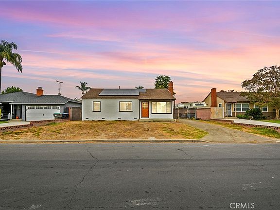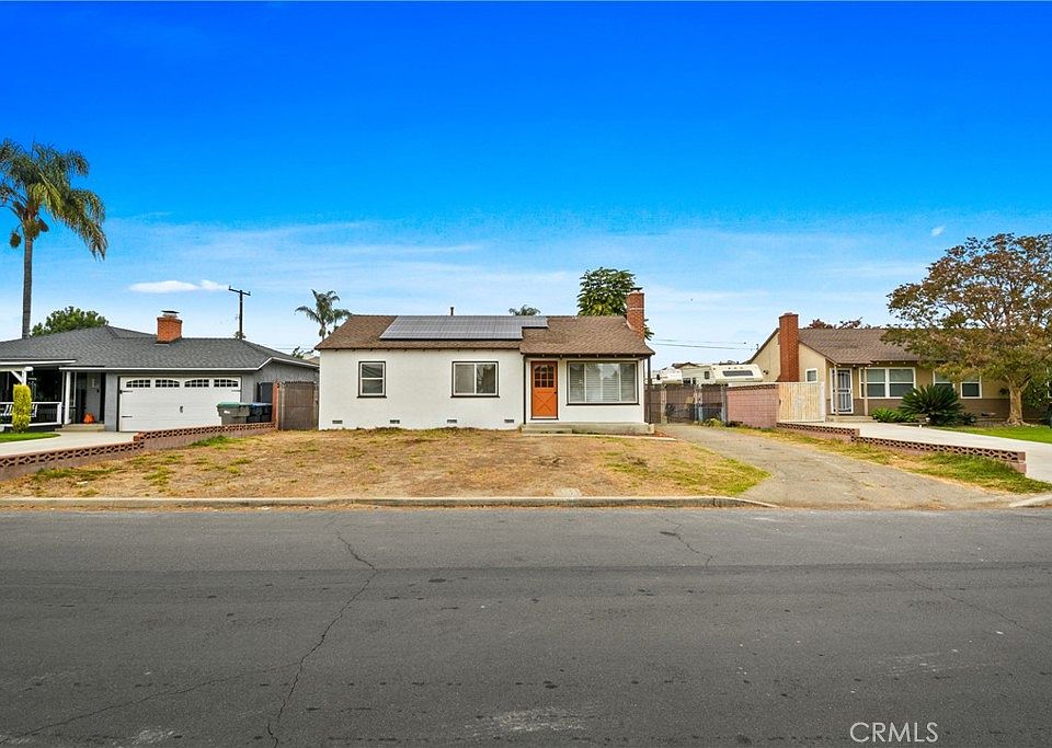 Welcome to this delightful Mid-Century Traditional home, featuring paid-in-full solar panels, 3 bedrooms, 1.5 baths, and 1,164 sq ft of living space on an expansive 8,340 sq ft flat lot. The large lot offers direct driveway access to the backyard and a detached garage, perfect for an ADU conversion, RV parking, or storage for work or recreational vehicles. The exterior has been freshly painted in warm, earth-tone hues, giving the home a clean and inviting look. You’re greeted by a charming front porch, setting the tone for this light, bright, and freshly updated interior. Inside, enjoy new luxury vinyl plank flooring, upgraded baseboards, new windows, plantation shutters in the family and dining rooms, and fresh interior paint throughout. The cozy family room centers around a classic brick fireplace, leading into the inviting kitchen with freshly painted cabinets, matte-black hardware, tile countertops, and a breakfast bar that opens to the dining area with an upgraded ceiling fan. All three bedrooms are spacious, and the hall bath features a shower-in-tub, freshly painted cabinetry, new matte-black hardware, and tile counters. The powder room includes a newer sink and toilet, while the interior laundry room offers built-in shelving for convenience. Additional highlights include a newer AC system with thermostat, new toilets, and a newly painted exterior including garage and trim. The newer automatic garage door adds function and curb appeal. The front and backyard are open canvases, ready for your creative touch. Whether you envision a landscaped retreat, an outdoor entertaining space, or ample parking for RVs and work trucks, the possibilities are endless. Located in a quiet, established Chino neighborhood, this home is close to Prado Regional Park, Chino Hills State Park, and the Planes of Fame Air Museum, with easy access to shops, dining, and major freeways.