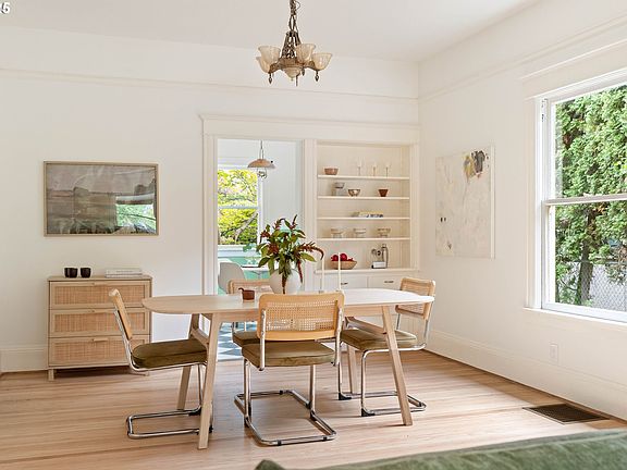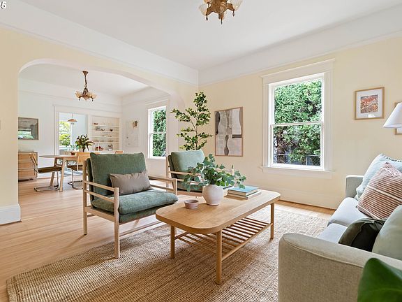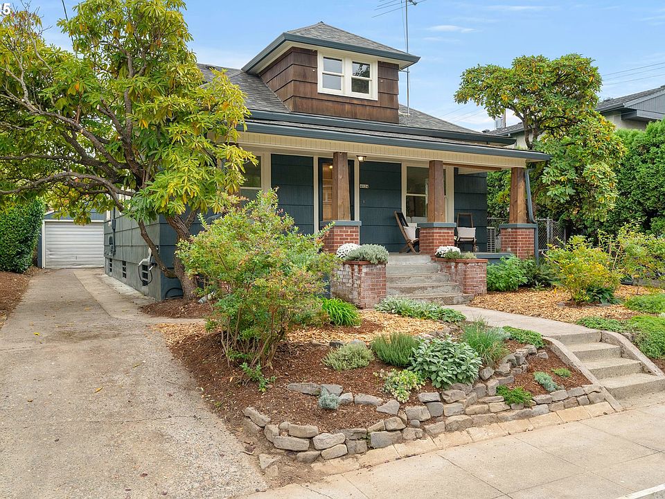 Curve Appeal! This one will truly make your heart skip: a vintage charmer where big living spaces glow with south-facing light and graceful curved archways and signature character abound. Original oak and fir floors were just refinished to a gleam. The kitchen? A stunner. Your friends will 100% be jealous. Spacious, remodeled with loving care, with full timeless charm intact. Picture yourself in the cutest eat-in jade nook you’ve ever seen, sunlight dappling the checkerboard floor, Bosch dishwasher quietly humming under Boos solid cherry butcher block counters. A mudroom and door into the backyard makes indoor-outdoor flow a breeze. The bathroom was fully remodeled with timeless tile work by Hawthorne Tile and a Strom bath fixture that keeps the vintage soul alive but adds modern function. The upstairs space works as almost anything you want. Primary bedroom with walk-in closet, play room, out-of-the-way of office? Your choice! Updates throughout mean you get both style and peace of mind: Carrier heat pump with central A/C (2023), 2017 electrical panel, re-wired and grounded main floor outlets, updated second-floor wiring and insulation (2025), Level 2 Siemens EV charger in the driveway, updated plumbing lines (copper + PEX), and detachable storm windows.The basement is just a basement, but it’s perfect for storage or workshop space, with a convenient exterior door to the back yard. The fenced back yard has plenty of room to garden or lounge, and the big front porch is just begging for slow mornings and summer evening hang-outs (plus lots of mature blueberries to share). Grab a coffee or juice at Best Friend Café just down the street, with parks, restaurants, and shops so close! Walk Score 81 (very walkable), Bike Score 94 (biker’s paradise).This isn’t just a house, it’s a warm welcome into a sweet neighborhood where light, charm, and community curve together perfectly. Come see! [Home Energy Score = 5. HES Report at https://rpt.greenbuildingregistry.com/hes/OR10241981]