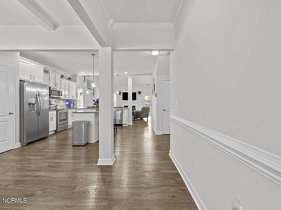 Step inside and you are greeting by a formal dining room that exudes sophistication with its coffered ceilings, beautiful cabinetry offering the extra storage you need, and an eye-catching accent wall. This space seamlessly flows into an open-concept kitchen, where a large island takes center stage, perfect for casual meals and entertaining.