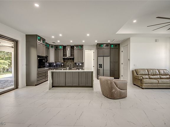 The outdoor living space features an oversized lanai overlooking a large backyard with room for a pool and electric already in place for future installation. The outdoor kitchen includes a full size Samsung refrigerator, disposal, and ample space for entertaining.